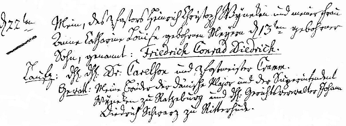 Sohn, genannt: arine Louise gebohrene Meyer d 13ten Friedrich Conrad DiedrichTaufz: H. H. Dr. Carelson und PostGevatt: Mein Bruder der dänische Major und der SuWyneken zu Ratzeburg und H. Gerichtsverwalter Johann
